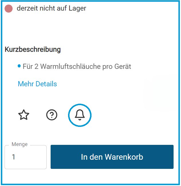 Ouvrez l’article de votre choix dans la boutique et cliquez sur le symbole de la cloche marquée. Entrez l’adresse e-mail dont vous souhaitez être informé et vous serez informé dès que l’article sera à nouveau disponible.