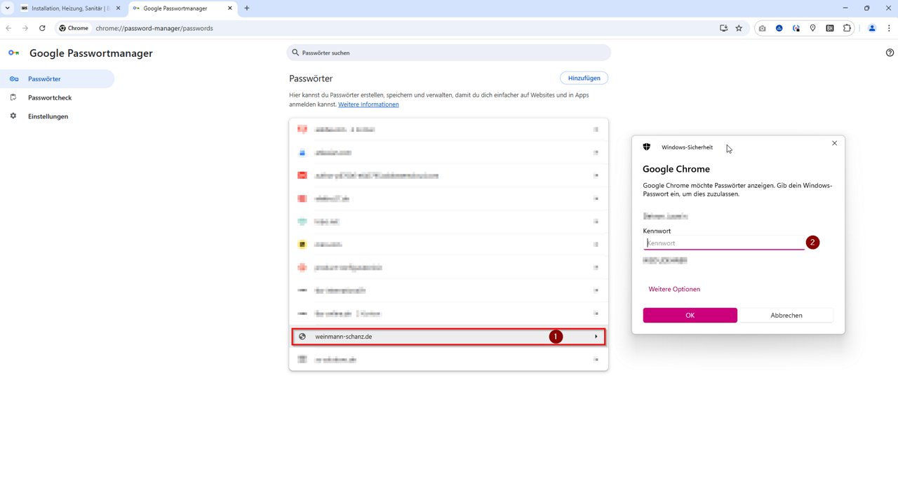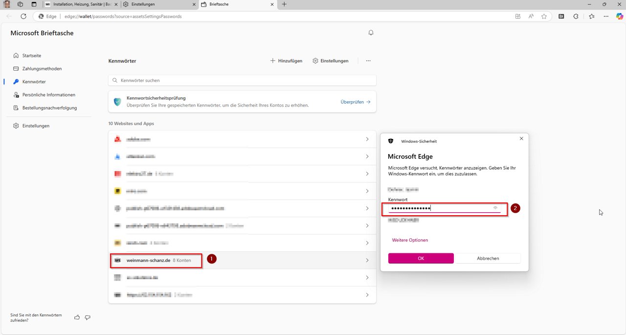 2. Je ziet nu een lijst met al je opgeslagen toegangsgegevens voor verschillende websites. Daar vind je ook een vermelding voor WS Weinmann & Schanz (1). Klik op deze vermelding en voer dan je wachtwoord in voor Password (2), dat je gebruikt om je aan te melden bij je Windows-account (dit is het wachtwoord dat je invoert wanneer je je pc opstart):