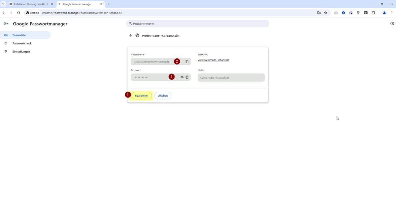 3. Je kunt de opgeslagen toegangsgegevens aanpassen via Edit (1). Voer onder Gebruikersnaam (2) je geldige e-mailadres voor de webshop (voorheen klantennummer) in, waarmee je ook in de nieuwe shop wilt inloggen, en je nieuw ingestelde Wachtwoord (3). Als je meerdere ingangen voor weinmann-schanz.de hebt, verwijder dan alle toegangen die niet meer nodig zijn, zodat er nog maar één ingang overblijft.