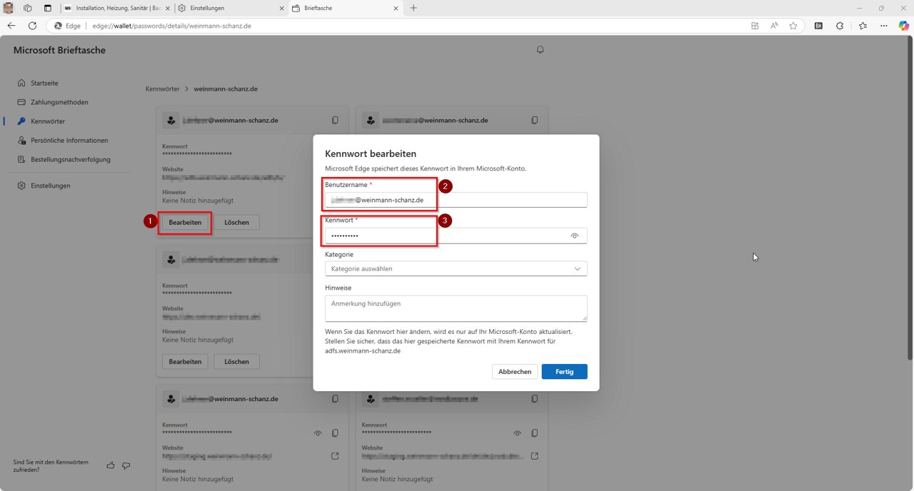 4. Via Edit (1) kun je de opgeslagen toegangsgegevens aanpassen. Voer onder Gebruikersnaam (2) je voor de webshop geldige e-mailadres (voorheen klantennummer) in, waarmee je ook in de nieuwe shop wilt inloggen, en je nieuw ingestelde wachtwoord(3). Als je meerdere ingangen hebt voor weinmann-schanz.de, verwijder dan alle toegangen die niet meer nodig zijn, zodat er nog maar één ingang overblijft.