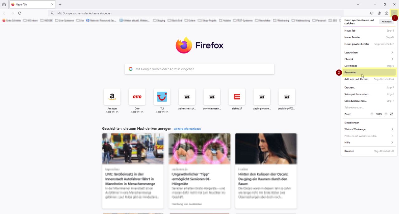 1. Klik op de drie streepjes rechtsboven (1) en open dan Wachtwoorden (2):